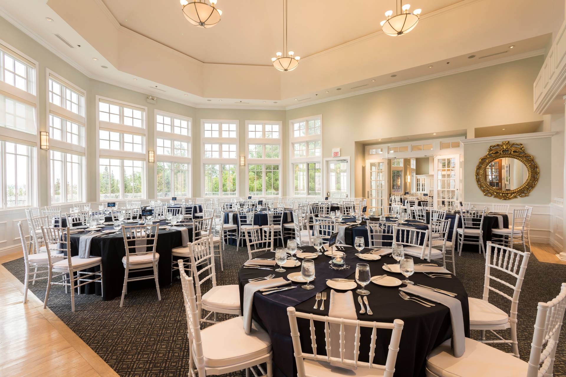 The clubhouse's main space offers traditional decor, cathedral ceilings, and large windows overlooking the course and the water. With room for up to 70 guests, it functions well alone, or can be combined with other spaces for larger groups.